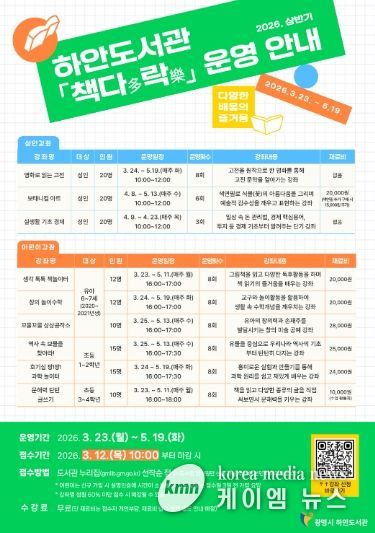 (케이엠뉴스) 광명시 하안도서관은 상반기 정기 독서문화 프로그램 ‘책다(多)락(樂)’ 수강생을 오는 12일부터 모집한다.