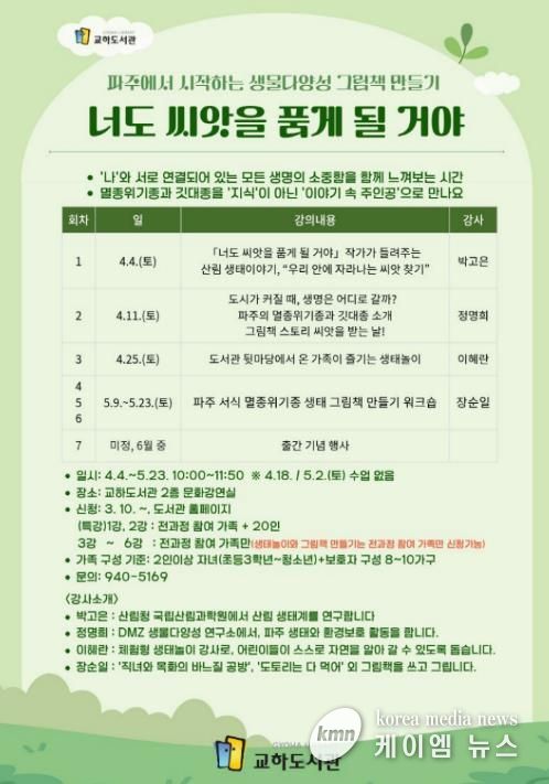 (케이엠뉴스) 파주시 교하도서관 오는 4월 4일부터 5월 23일까지 가족 참여형 지역연계 프로그램 ‘너도 씨앗을 품게 될 거야’를 매주 토요일 10시부터 11시 50분까지 교하도서관 2층 문화강연실에서 운영한다.