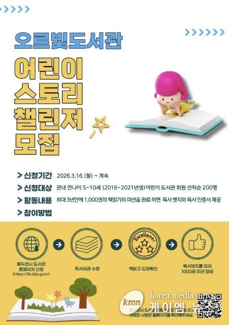 (케이엠뉴스) 동두천시 도서문화사업소는 3월 16일부터 관내 5-10세 어린이를 대상으로 ‘어린이 스토리 챌린저’ 참여자를 모집한다고 밝혔다. 이번 사업은 어린이의 자발적인 독서 습관 형성과 ‘책 읽는 동두천’ 분위기 조성 및 독서문화 확산을 위해 마련했다.
