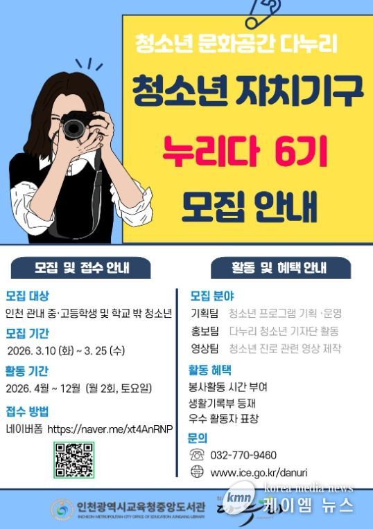 모집 대상은 인천 관내 중·고등학생 또는 학교 밖 청소년으로 접수 기간은 3월 10일부터 25일까지이며, 다누리 누리집의 공지사항에 안내된 네이버 폼으로 신청하면 된다.