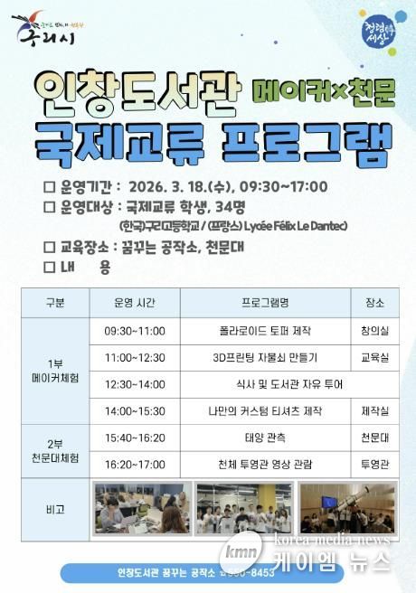 (케이엠뉴스) 구리시 인창도서관 꿈꾸는 공작소는 오는 3월 18일, 관내 학교의 국제교류 학사 일정과 연계해 외국인 학생들에게 한국 도서관의 특화된 메이커 문화와 천문 관측 활동을 소개하는 ‘메이커×천문 국제교류 프로그램’을 운영한다.