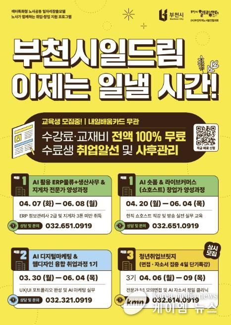 (케이엠뉴스) 부천시는 부천시일드림센터와 함께 2026년 상반기 취·창업 교육생을 모집한다. 이번 교육은 내일배움카드 발급 여부와 관계없이 수강료와 교재비를 전액 무료로 지원해 구직자의 교육 참여 부담을 낮췄다.