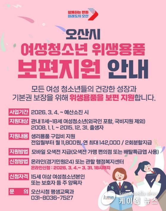 (케이엠뉴스) 오산시는 관내 11세부터 18세까지의 여성청소년을 대상으로 '여성청소년 위생용품 보편지원 사업'을 추진한다고 밝혔다.