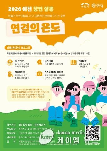(케이엠뉴스) 이천시 청년일자리카페 청년이룸(이천시 경충대로 2701-32)은 지역 청년들의 관계망 형성 및 역량 강화를 위한 청년이룸 네트워킹 데이 ‘연결의 온도’ 참가자를 3월 10일부터 모집한다고 밝혔다.