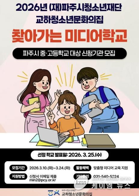(케이엠뉴스) (재)파주시청소년재단 교하청소년문화의집은 파주시 청소년의 미디어 이해력 향상과 디지털 역량 강화를 위해 ‘2026년 찾아가는 미디어학교’ 프로그램에 참여할 중·고등학교를 모집한다고 밝혔다.