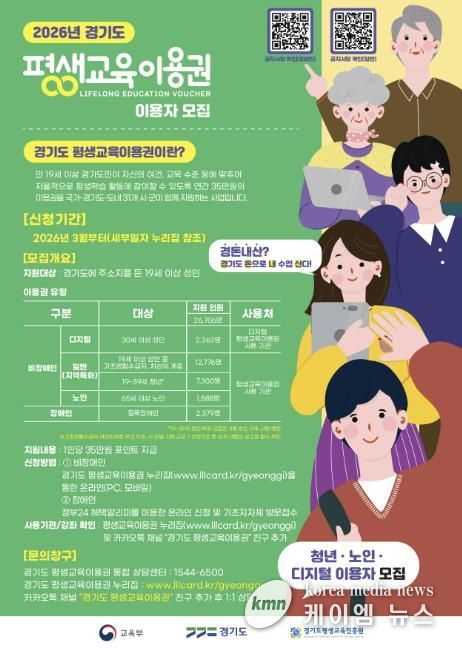 한편, 청년(19세~39세) 평생교육이용권은 4월 중 별도로 모집할 예정이며, 자세한 일정은 추후 안내할 예정이다.