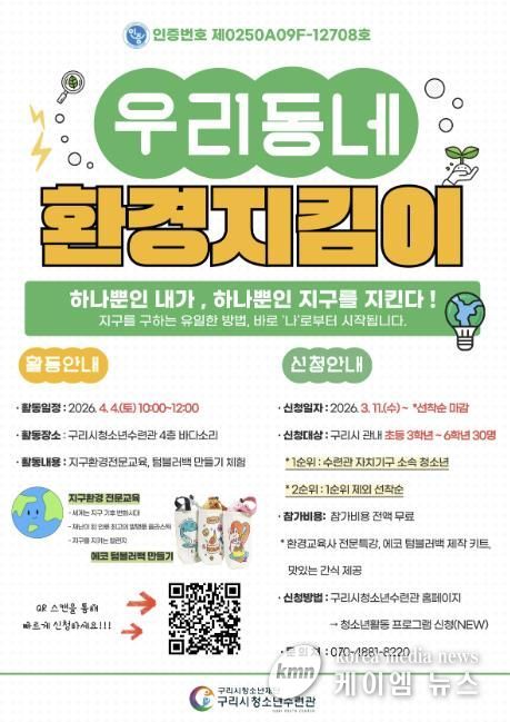 (케이엠뉴스) 구리시청소년재단 청소년수련관은 관내 청소년들이 지구 환경의 소중함을 배우고 실천할 수 있는 ‘우리 동네 환경 지킴이’ 프로그램의 참가자를 오는 3월 11일부터 선착순으로 모집한다고 밝혔다.