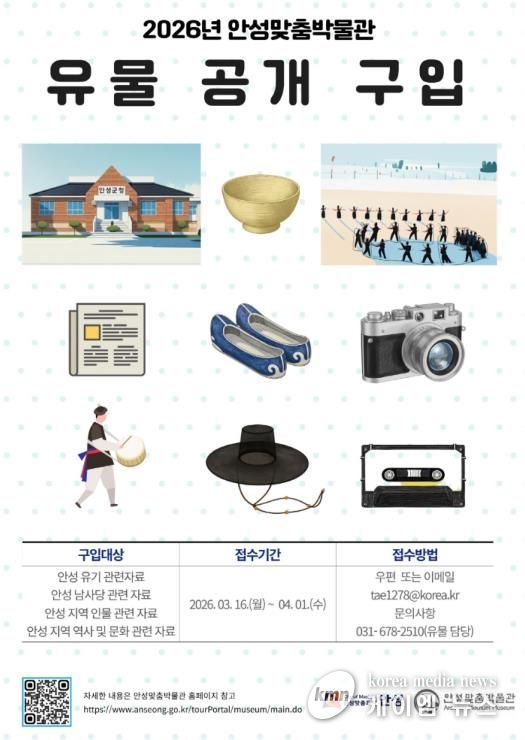 (케이엠뉴스) 안성시 안성맞춤박물관은 오는 3월 16일부터 전시․학술․교육자료 수집을 위한 유물 공개 구입을 추진한다고 밝혔다.