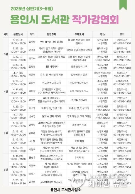 5월에는 7일 '명화의 탄생 그때 그 사람’의 저자 성수영 한국경제 기자(포곡도서관), 12일 '초등 영어 식스'의 저자 권태형 작가(성복도서관), 13일 '글쓰기가 필요하지 않은 인생은 없다'의 저자 김애리 작가(상현도서관), 16일 ‘호랭 떡집’의 저자 서현 작가(기흥도서관), 19일 ‘처음 만나는 한시 마흔 여섯가지 즐거움‘의 저자 박동욱 한양대 교수(보라도서관)가 강연할 예정이다.