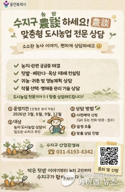 (케이엠뉴스) 용인특례시 수지구는 도시농업에 관심 있는 시민을 대상으로 전문 상담 프로그램인 ‘수지구 농담(農談)하세요’를 운영한다고 12일 밝혔다.