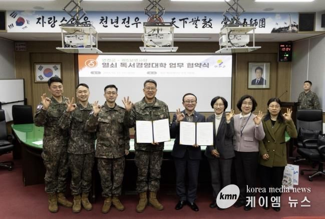 (케이엠뉴스) 연천군과 제5보병사단은 2026년 3월 11일 ‘열쇠부대 독서경영대학’의 원활한 운영과 협력을 위한 업무협약을 체결했다. 이번 협약은 '독서경영대학' 사업의 체계적 운영과 연계, 협력을 주요 내용으로 한다.