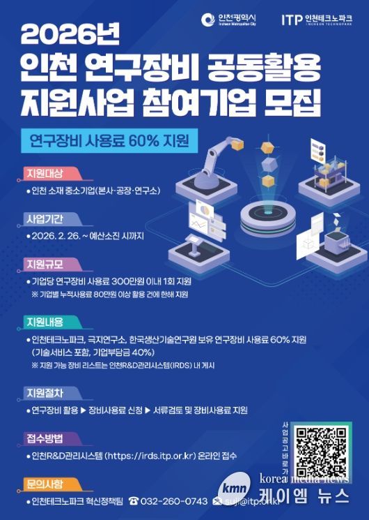 (케이엠뉴스) 인천테크노파크(인천TP)는 인천 지역 중소기업의 연구개발(R·D) 역량을 높이고 장비 사용료 부담을 줄여주기 위해, ‘2026년 인천 연구장비 공동활용 지원사업’ 참여기업을 모집한다고 밝혔다.