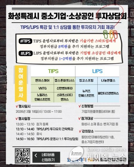 ‘화성특례시 중소기업·소상공인 투자상담회’는 화성시 중소기업 및 소상공인의 투자유치 역량 강화를 지원하기 위해 마련됐으며, TIPS(Tech Incubator Program for Startup) 및 LIPS(Licorn Incubator Program for Small brand) 프로그램을 중심으로 운영된다.