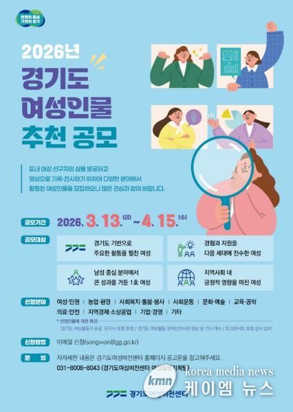 (케이엠뉴스) 경기도여성비전센터는 4월 15일까지 ‘2026년 경기도 여성인물’을 모집하고, 선정된 4명의 활동 영상을 전시한다고 13일 밝혔다.