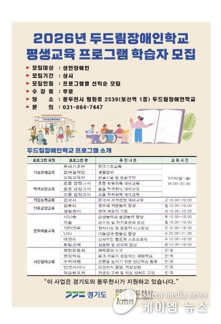 (케이엠뉴스) 동두천시가 장애인 평생교육 진흥을 위해 지원하고 있는 두드림장애인학교가 2026학년도 평생교육 프로그램 학습자를 모집한다.
