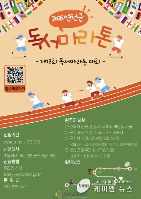 (케이엠뉴스) 연천군 도서관은 지난 12일부터 11월 30일까지 ‘제13회 독서마라톤대회’를 운영한다. 이번 대회는 책을 통한 군민 간 소통과 공감, 독서 문화 확산을 목적으로 한다.