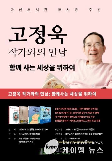 (케이엠뉴스) 김포시 마산도서관은 도서관 주간(4월 12일~18일)을 맞아 오는 4월 18일 오후 3시 ‘고정욱 작가와의 만남: 함께 사는 세상을 위하여’를 개최한다고 밝혔다.