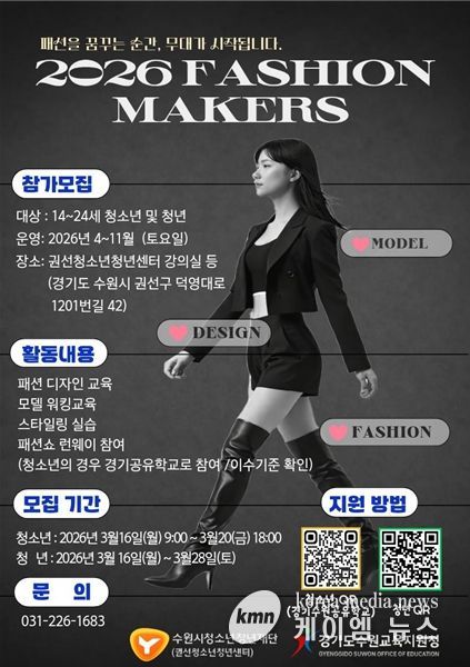 (케이엠뉴스) 수원시청소년청년재단 권선청소년청년센터는 패션 분야 진로에 관심 있는 청소년과 청년을 대상으로 ‘패션메이커스(Fashion Makers)’ 프로그램 참가자를 모집한다.