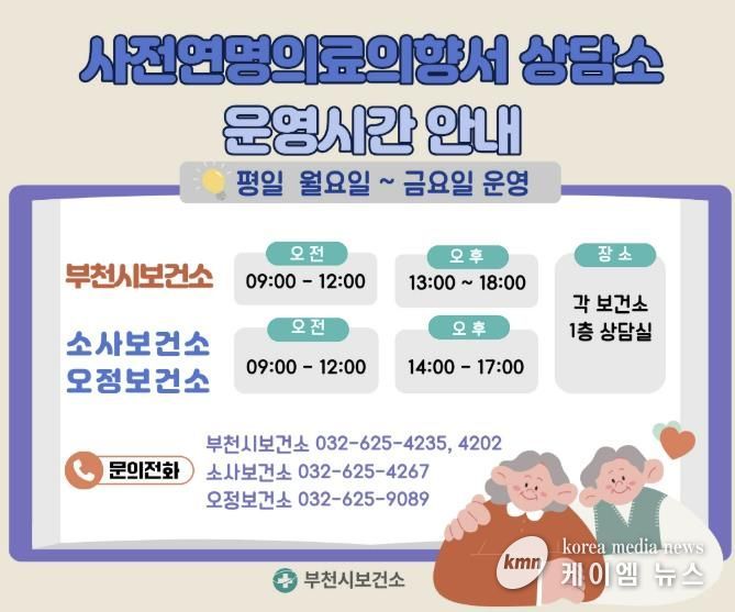 (케이엠뉴스) 부천시는 부천시․소사․오정보건소에서 시민이 삶의 마지막 순간까지 존엄성과 자기결정권을 존중받을 수 있도록 ‘사전연명의료의향서 상담소’를 운영하고 있다.