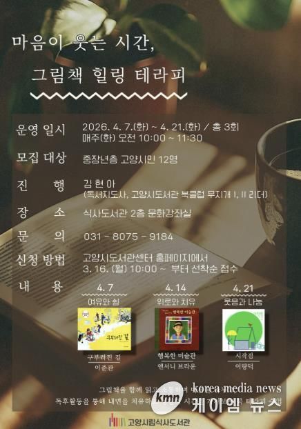 (케이엠뉴스) 고양특례시 식사도서관은 오는 4월 7일부터 공공도서관 독서문화 프로그램 ‘마음이 웃는 시간, 그림책 힐링 테라피’을 운영한다.