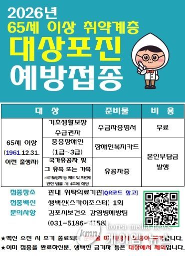 (케이엠뉴스) 김포시가 17일부터 관내 65세 이상 취약계층을 대상으로 대상포진 예방접종을 실시한다.
