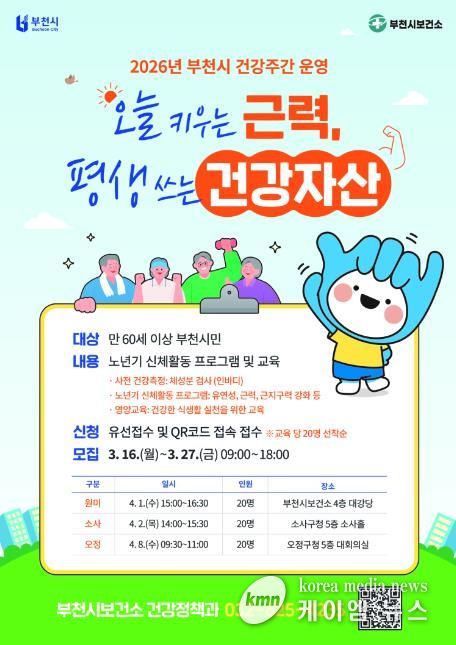 (케이엠뉴스) 부천시는 4월 1일부터 4월 8일까지 ‘건강주간’으로 지정하고 지역 주민의 건강한 노년 생활을 지원하기 위해 ‘오늘 키우는 근력, 평생 쓰는 건강자산’ 프로그램을 운영한다.