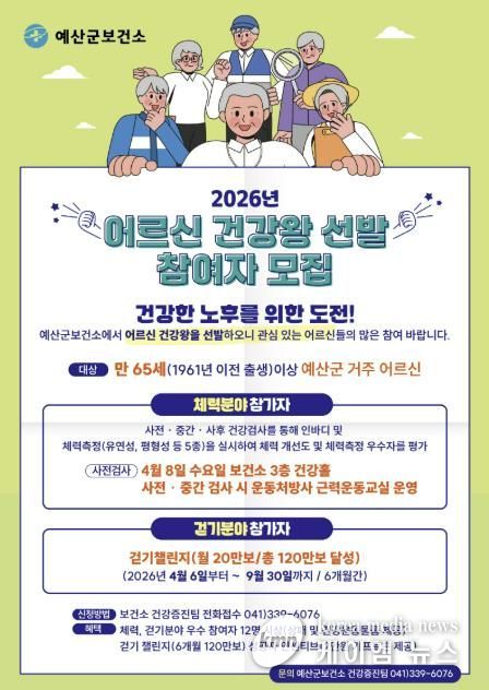(케이엠뉴스) 예산군보건소는 어르신의 자발적인 신체활동 참여를 유도하고 건강한 노후생활을 지원하기 위해 ‘2026년 어르신 건강왕 선발’ 참가자를 모집한다고 밝혔다.