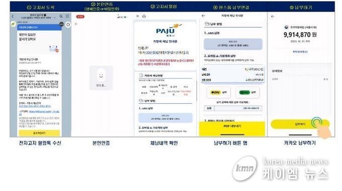 (케이엠뉴스) 파주시는 지방세 체납액 징수율을 제고하기 위해 도입한 '체납 안내 카카오 알림톡 모바일 전자고지 서비스'가 뚜렷한 성과를 거두고 있다.