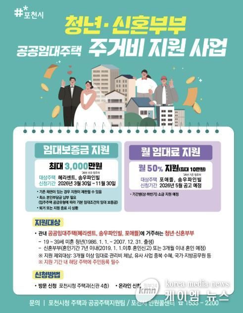 (케이엠뉴스) 포천시는 관내 공공임대주택에 거주하는 청년 및 신혼부부를 대상으로 ‘2026년 청년·신혼부부 공공임대주택 주거비 지원사업’을 시행한다.