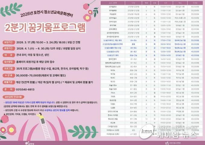모집 대상은 관내 유아·청소년·성인이며, 신청은 3월 24일 오후 6시까지 포천시청소년교육문화센터 누리집을 통해 선착순으로 진행된다.