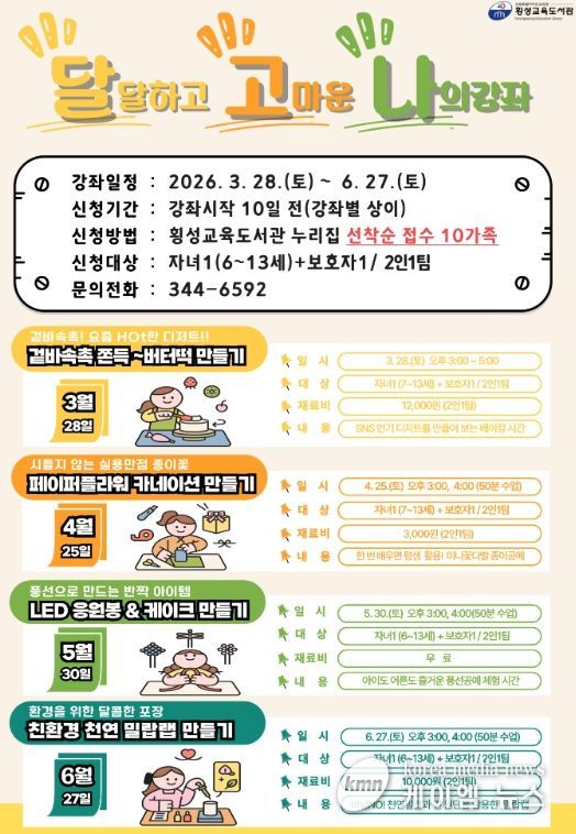 (케이엠뉴스) 횡성교육도서관은 3월 28일, 4월 25일, 5월 30일, 6월 27일 4회에 걸쳐 가족과 함께하는 상반기 달고나(달달하고 고마운 나의) 강좌를 운영한다.