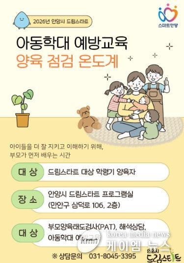 (케이엠뉴스) 안양시가 아동 학대를 사전에 차단하고 건강한 양육 환경을 조성하기 위해 맞춤형 부모 교육 프로그램인 ‘2026 드림스타트 양육 점검 온도계’를 본격 가동한다고 18일 밝혔다.