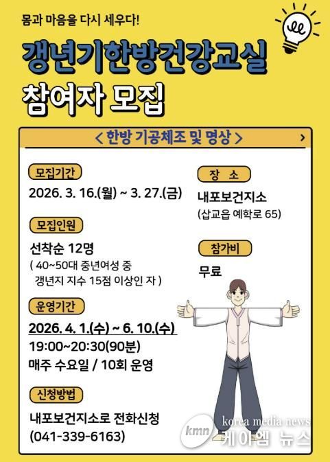 (케이엠뉴스) 예산군 내포보건지소는 갱년기 증상으로 어려움을 겪는 중년 여성의 건강 증진과 삶의 질 향상을 위해 2026년 ‘갱년기 한방건강교실’ 프로그램을 운영한다.