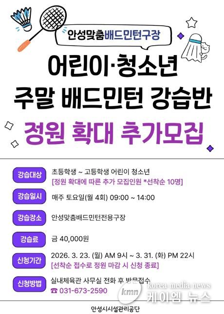 (케이엠뉴스) 안성시시설관리공단은 안성 시민 생활체육 활성화를 위해 현재 운영 중인 주말 어린이・청소년 배드민턴 강습반 정원을 확대하고 추가 수강생을 모집한다고 밝혔다.