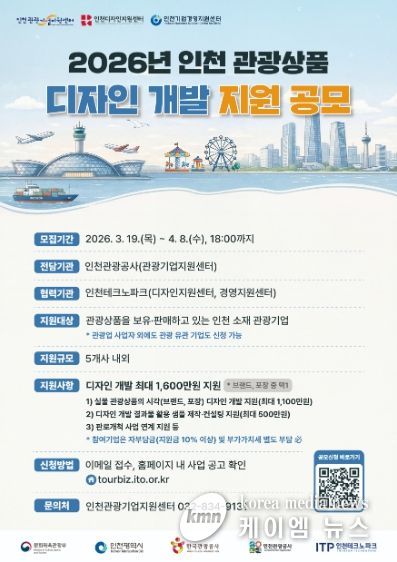 (케이엠뉴스) 인천광역시와 인천관광공사는 지역 관광상품의 시장 경쟁력을 강화하고 브랜드 가치를 높이기 위해 '2026년 인천 관광상품 디자인 개발 지원 사업'에 참여할 기업을 3월 19일부터 4월 8일까지 모집한다고 밝혔다.