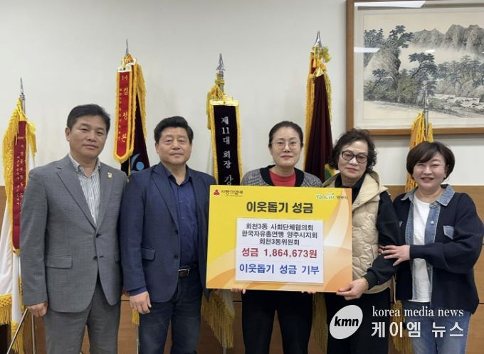 (케이엠뉴스) 양주시 회천3동은 지난 17일 자유총연맹 양주시지회 회천3동 위원회와 사회단체협의회가 행정복지센터를 방문해 이웃 사랑 성금 약 180만 원을 전달했다고 밝혔다.