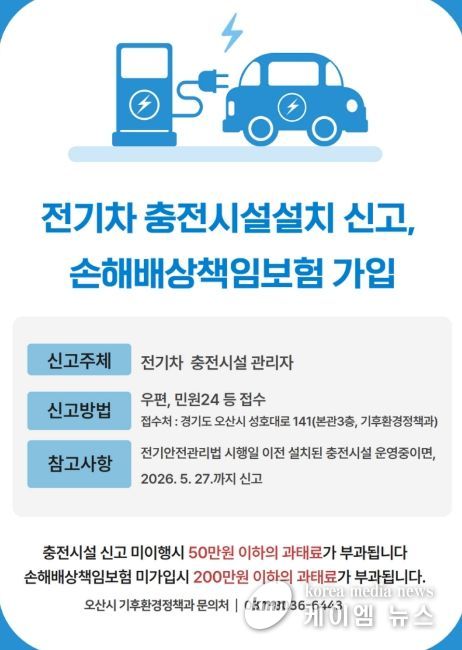 (케이엠뉴스) 오산시는 전기자동차 충전시설의 안전한 관리와 사고 발생 시 피해자 보호를 위해 충전시설 설치(변경) 신고와 책임보험 가입이 의무화됐다고 23일 밝혔다.