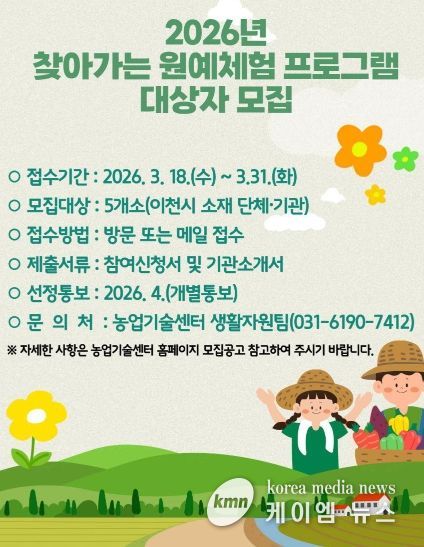 (케이엠뉴스) 이천시는 2026년 찾아가는 도시농업 원예체험 프로그램 대상자를 3월 31일까지 모집한다고 밝혔다.