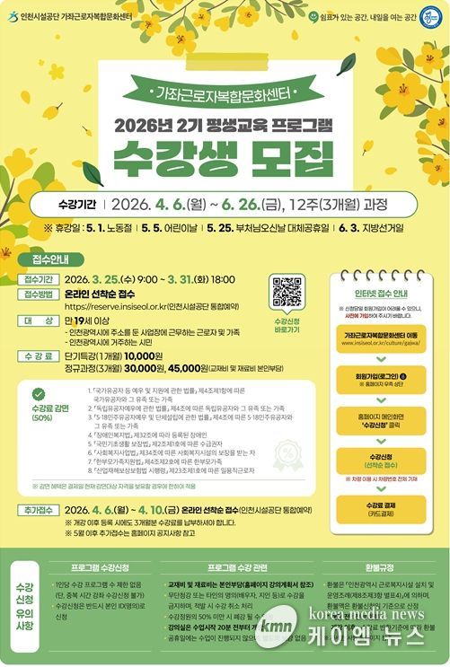 (케이엠뉴스) 인천시설공단 가좌근로자복합문화센터가 2026년도 제2기 평생 교육프로그램 수강생을 이달 31일까지 모집한다.
