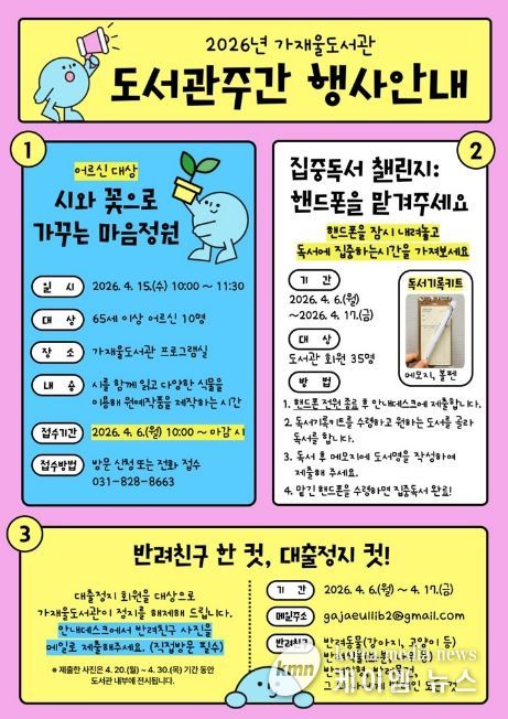 (케이엠뉴스) 의정부가재울도서관은 4월 도서관주간을 맞아 시민들이 책과 도서관을 더욱 친숙하게 느낄 수 있도록 프로그램과 이벤트를 운영한다.