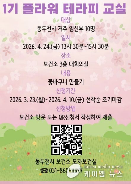 이번 플라워테라피 태교 교실은 4월 24일 보건소 3층 대회의실에서 진행하며 신청 기간은 오는 10일까지로 동두천시 보건소에 등록된 임신부를 선착순 모집한다.