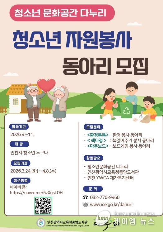 (케이엠뉴스) 인천광역시교육청중앙도서관 청소년문화공간 ‘다누리’는 3월 24일부터 4월 8일까지 인천 관내 청소년을 대상으로 자원봉사 동아리 참여자를 모집한다.