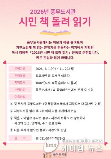 (케이엠뉴스) 김포시 풍무도서관은 오는 4월부터 ‘2026년 시민 책 돌려 읽기’ 독서 릴레이를 운영한다.