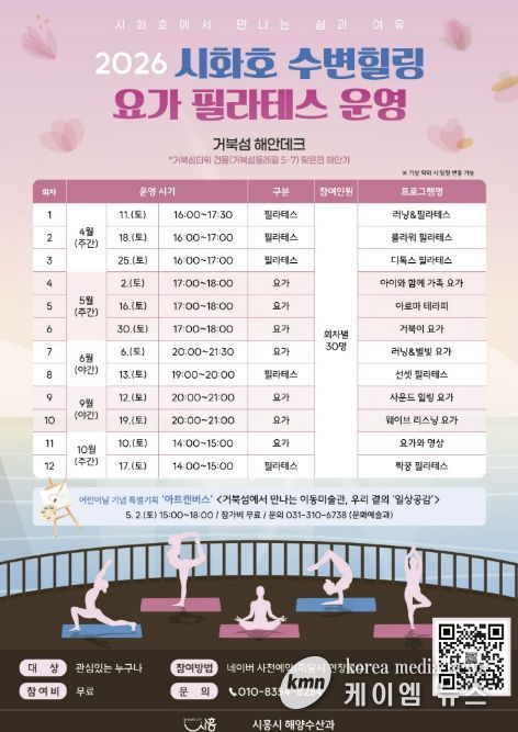 (케이엠뉴스) 시흥시는 시화호 수변의 자연경관을 활용해 시민들에게 일상의 여유와 휴식을 제공하는 ‘시화호 수변 힐링 프로그램’을 오는 4월 11일부터 10월 17일까지 운영한다.