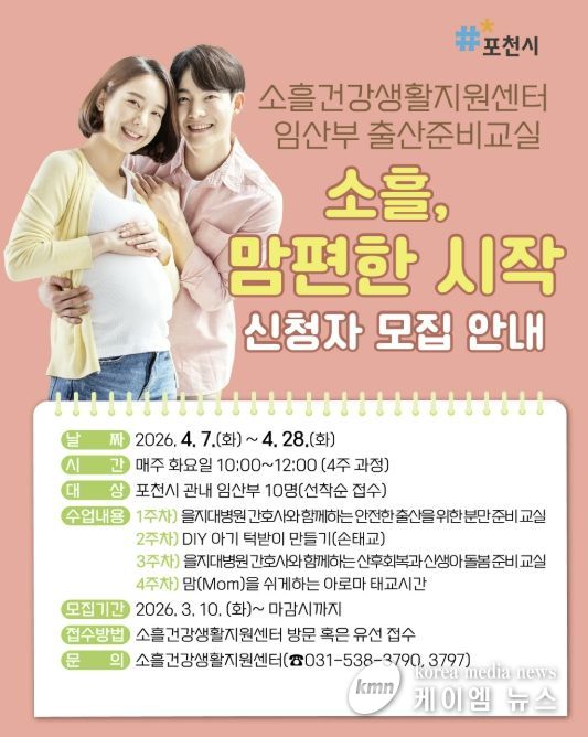 (케이엠뉴스) 포천시 소흘건강생활지원센터는 임산부의 건강한 임신과 안전한 출산을 지원하기 위해 임산부 출산준비교실 ‘소흘, 맘편한 시작’ 참여자를 모집한다.