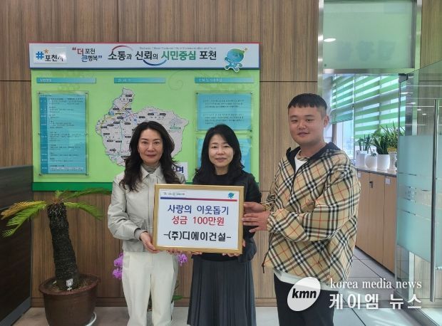 (케이엠뉴스) 포천시 신읍동 소재 ㈜디에이건설은 지난 24일 지역 내 어려운 이웃을 돕기 위해 가산면 행정복지센터에 성금 100만 원을 기탁했다.