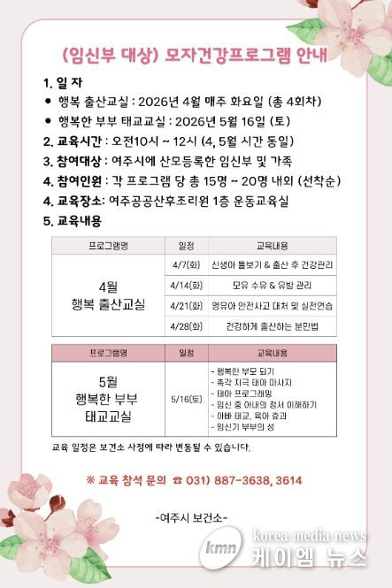 (케이엠뉴스) 여주시 건강증진과는 관내 임산부가 출산에 대한 전반적인 지식과 기술을 습득하여 건강하고 행복한 출산이 되도록 2026년도 상반기 '출산준비교실' 운영한다.