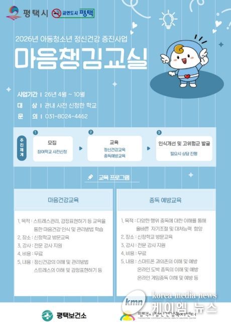 (케이엠뉴스) 평택시는 스쿨케어 사업의 일환으로 관내 학교 학생들을 대상으로 『마음챙김교실』을 운영한다고 밝혔다. 이번 프로그램은 학생들이 교육을 통해 정신건강을 올바르게 인식하고 스스로 관리할 수 있도록 지원함으로써 마음 건강 증진을 도모하는 데 목적이 있다.