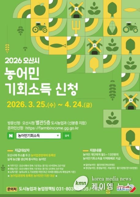 (케이엠뉴스) 오산시는 농업·농촌의 공익적 가치 보장과 농어촌 소멸위기 대응을 위해 ‘2026년 농어민 기회소득’ 신청·접수를 3월 25일부터 4월 24일까지 진행한다고 밝혔다.