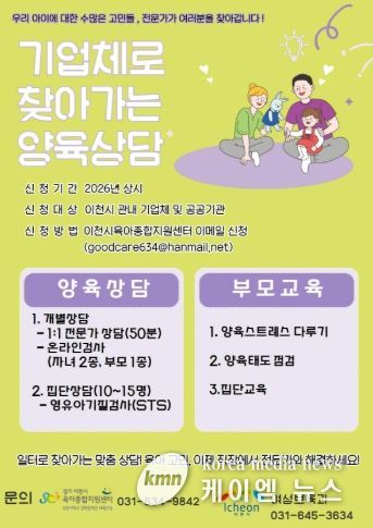 (케이엠뉴스) 이천시는 맞벌이나 교대근무 등 열악한 근무 여건으로 인해 양육 정보 접근에 어려움을 겪는 부모들을 위해 ‘기업체로 찾아가는 양육상담 서비스’를 본격 운영하다고 밝혔다.